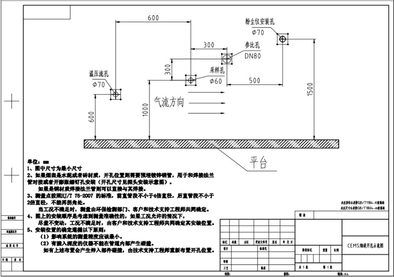 煙氣在線監(jiān)測系統(tǒng)在煙囪上的開孔位置大概在:煙囪直徑的4倍處(變徑之上),根據(jù)煙囪氣流的方向,從左往右開孔依次是:溫壓流孔、氣體采樣孔、環(huán)保參比孔、粉塵(顆粒物)取樣孔、濕度孔5個取樣孔。孔徑的大小:溫壓流孔70mm/采樣孔60mm/參比孔80mm/粉塵孔70mm。
