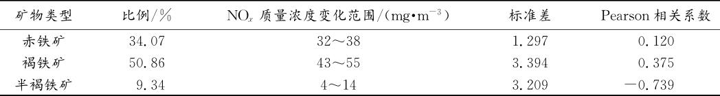 表1混勻礦中鐵礦粉的礦物類型與煙氣中NOx質(zhì)量濃度的相關(guān)分析