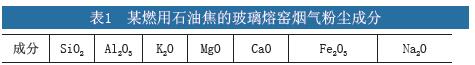 玻璃熔窯排放煙氣的粉塵有以下幾個特點:① 濃度低(1 0 0~8 0 0 m g / N m 3):燃用天然氣時,粉塵主要來源于原料的高溫分解產物,濃度一般低于200mg/Nm3;燃燒石油焦時,除原料分解外,粉塵還來源于石油焦中的灰分,但濃度一般也不超過800mg/Nm3。②粒徑小(<2μm,平均粒徑0.7μm)、表面能大、黏附性強。③成分復雜,以Na2SO4 鹽為主,燃用石油焦時,還含有V2O5等催化成分,表1為某燃用石油焦的玻璃熔窯煙氣粉塵成分檢測數據。