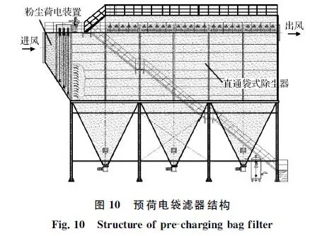 針對轉爐二次煙氣的排放特征,中鋼集團天澄環(huán)保科技股份有限公司開發(fā)了預荷電袋濾器除塵技術,將預荷電和直通式袋式除塵器復合形成一體化裝置,如圖10所示。粉塵預荷電后在濾袋表面將形成海綿狀粉餅結構,能提高凈化效率,同時降低運行阻力。中鋼天澄在鞍鋼煉鋼總廠2×180t轉爐二次煙氣凈化項目中建成示范工程,處理風量2×60萬m3/h。2014年12月正式投運,截止目前持續(xù)穩(wěn)定,運行可靠,顆粒物排放質量濃度低于10mg/m3,技術性能指標達到超低排放,運行阻力為700~1 000Pa,低于傳統(tǒng)袋式除塵器。目前,在日照鋼鐵、新余鋼鐵、正大特鋼、唐鋼青龍、柳鋼等得到推廣應用。