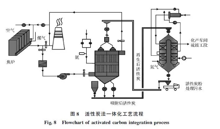活性炭法具有系統(tǒng)占地面積小,所用物資均可市場采購,特別是該系統(tǒng)充分利用了焦化系統(tǒng)的各項資源,沒有新的污染物產生的優(yōu)點。但該工藝存在大規(guī)模改造應用的經濟性較差問題。