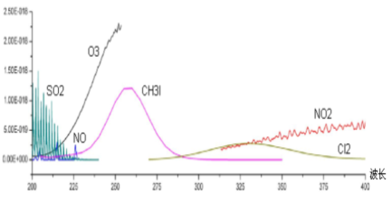 分析儀采用紫外差分算法檢測氣體濃度,其中SO2、NO、NO2等氣體在紫外波段存在吸收(如圖二),利用此光路(如圖一)即可計算出吸收光譜,然后利用DOAS技術,可以計算得到SO2、NO、NO2等氣體的含量,DOAS技術可以確保計算結果受光路污染、氣體中粉塵等雜質的影響小。
