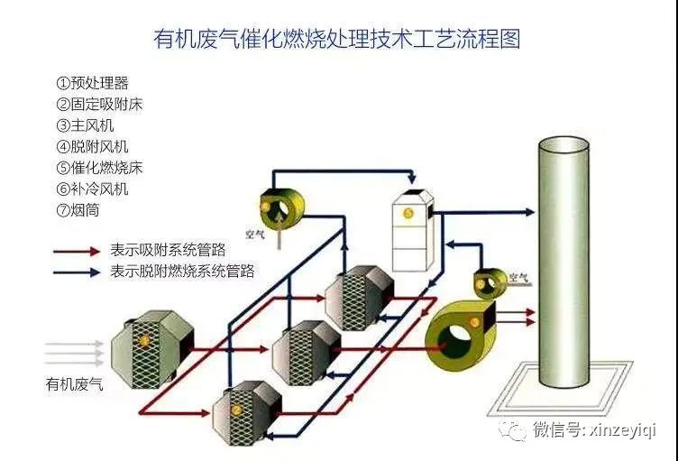 含有機污染物廢氣進入吸附裝置,揮發性有機物大部份被吸附裝置吸附,而成為較干凈的空氣,這部份干凈的氣體排放至大氣中。被吸附裝置吸附的大部分有機污染物則進入脫附再生區,在此區完成脫附再生,該過程主要是利用高溫空氣將脫附再生。經過再生后,吸附裝置吸附的廢氣經脫附而成為高濃度的有機廢氣。這部分高濃度的有機廢氣進入催化燃燒床,有機廢氣加熱到催化起燃問題以上,廢氣經過安裝有催化劑的床層時,廢氣中的VOCs轉化為無害的CO2和水,以達到去除有機物的目的。